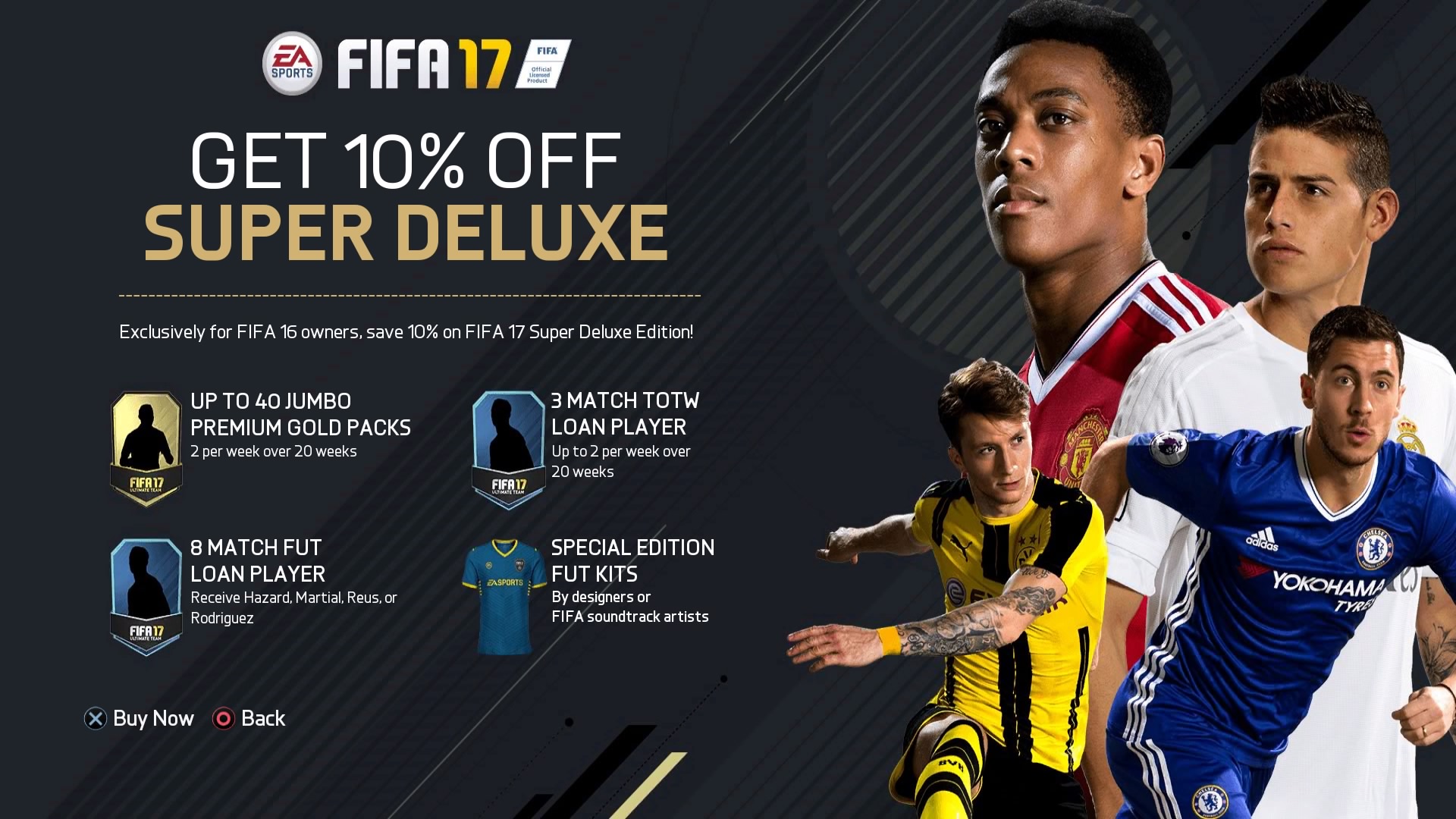 Si tienen FIFA 16 en el PS4 o Xbox One sepan que ya pueden pre-ordenar FIFA 17 Super Deluxe Edition (el contenido se muestra en la foto de arriba) y se ahorrarán un diez por ciento de su compra.