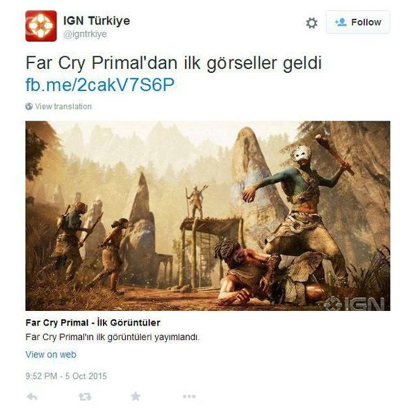 Ubisoft anunció que pronto presentarán un nuevo título, pero la sorpresa se ha visto arruinada ya que el medio IGN Turquía publicó en Twitter una noticia que confirmaba el juego Far Cry Primal. Dicho tweet contaba con una imagen que muestra una ambientación en la época de la prehistoria. El tweet fue borrado unos minutos después de su publicación.