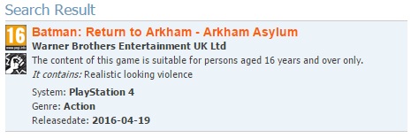 Además de esta información, el sistema de clasificación por edades PEGI, acaba de presentar el registro de Batman: Return to Arkham – Arkham Asylum para PlayStation 4, por lo que también se espera el registro de Batman: Return to Arkham – Arkham City, ya que la colección incluirá ambos títulos.