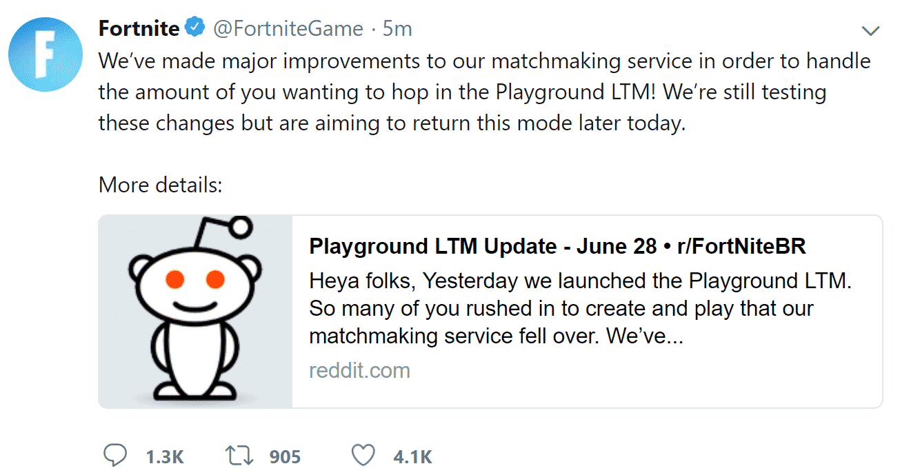 “Hemos realizado importantes mejoras en nuestro servicio de búsqueda de parejas para poder manejar la cantidad de personas que desean saltar en el campo de juegos LTM. Todavía estamos probando estos cambios, pero apuntamos a regresar este modo más tarde hoy,” dijo Epic Games en la cuenta de Twitter de Fortnite.