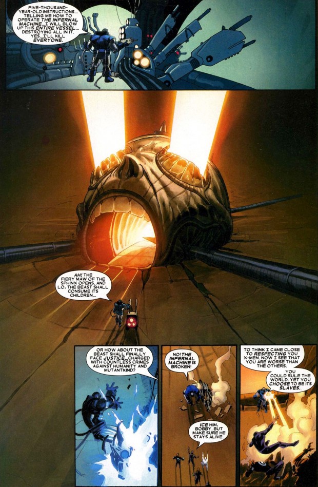 Antes de finalizar la pelea, las bombas nucleares están a punto de llegar a caer sobre la ciudad que no tienen la vigilancia de Apocalypse, pues sus campos de fuerza fueron destruidos antes. Al final, las bombas se encargan de acabar con el poderoso mutante.