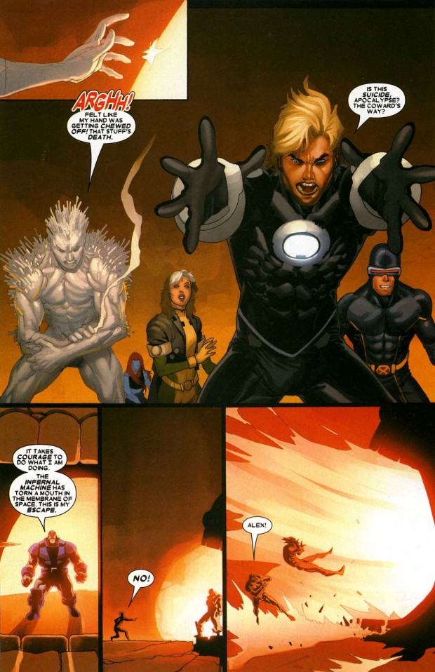 Después de uno de sus argumentos más tontos, Apocalypse tomó la decisión de quitarse la vida en X-Men #186 arrojándose en los motores que propulsaban su Sphinx.