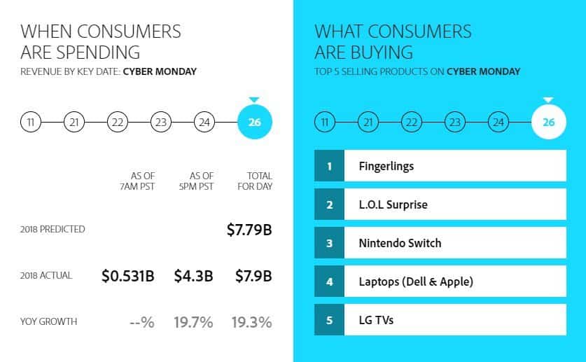 Según un reporte de Adobe Analytics el Nintendo Switch fue el único producto de videojuegos en colocarse en el Top 5 de los productos más vendidos durante el Cyber Monday en Estados Unidos. Junto a este se encuentra la línea de juguetes Fingerlings, L.O.L. Surprise!, así como de las líneas de laptops de Dell y Apple y de los televisores LG.