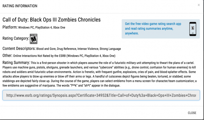 La ESRB ha clasificado Call of Duty: Black Ops 3 Zombie Chronicles, aunque no se conoce mucha información, pues la página web de la clasificación -que fue retirada hace poco- mostraba la misma descripción que la página de Call of Duty: Black Ops 3.