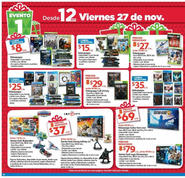 Walmart tendrá varios títulos en oferta – incluyendo The Witcher 3, Batman: Arkham Knight, The Elder Scrolls Online o Grand Theft Auto V – por tan solo $25. Además, las consolas Xbox One y PlayStation 4 estarán a un precio de $299 y los controles de ambas consolas costarán $39 cada una.