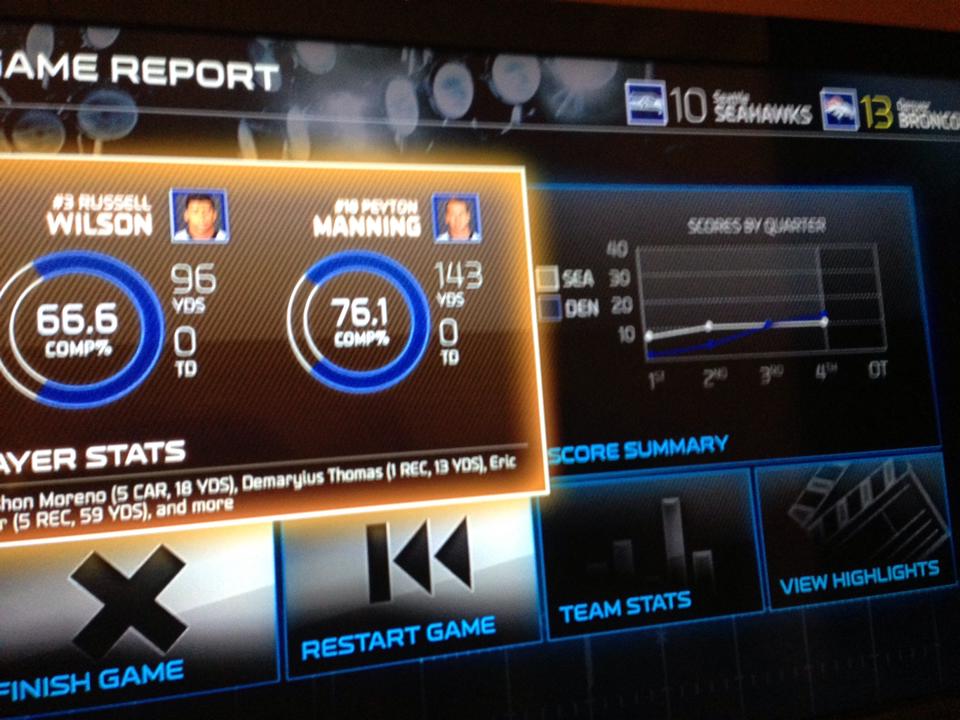 Los expertos le han dado la victoria a los Broncos de Denver y su ‘quarterback’ Payton Manning, pero todos sabemos que será un juego bastante difícil para ambos equipos. Pero, antes estos pronósticos, me he tomado la tarea de hacer un juego de simulación en el videojuego Madden 25 para Xbox One, para ver sí existe algún otro final, así que aquí los resultados: