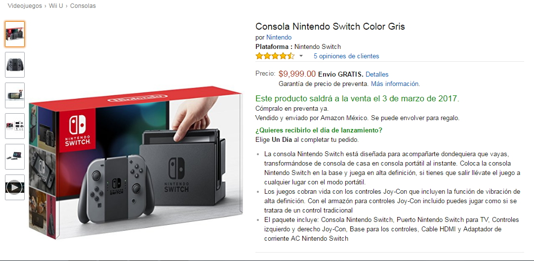 La descripción del producto revela que se trata de la consola gris, la cual viene acompañada de los JoyCon, base para los controles, cables HDMI, adaptador de corriente AC y el dock para conectar la consola.