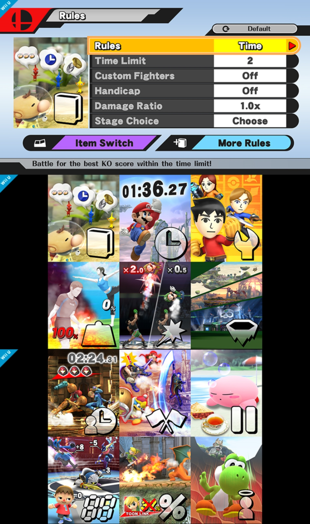 La primera parte de esta imagen es la escena de las reglas a establecer para las peleas. Las otras partes de la imagen muestran imágenes que aparecerán mientras vas viendo y cambiando las reglas. Además de todo eso, Sakurai menciona que puedes crear diferentes reglas desde que comienzas a jugar.