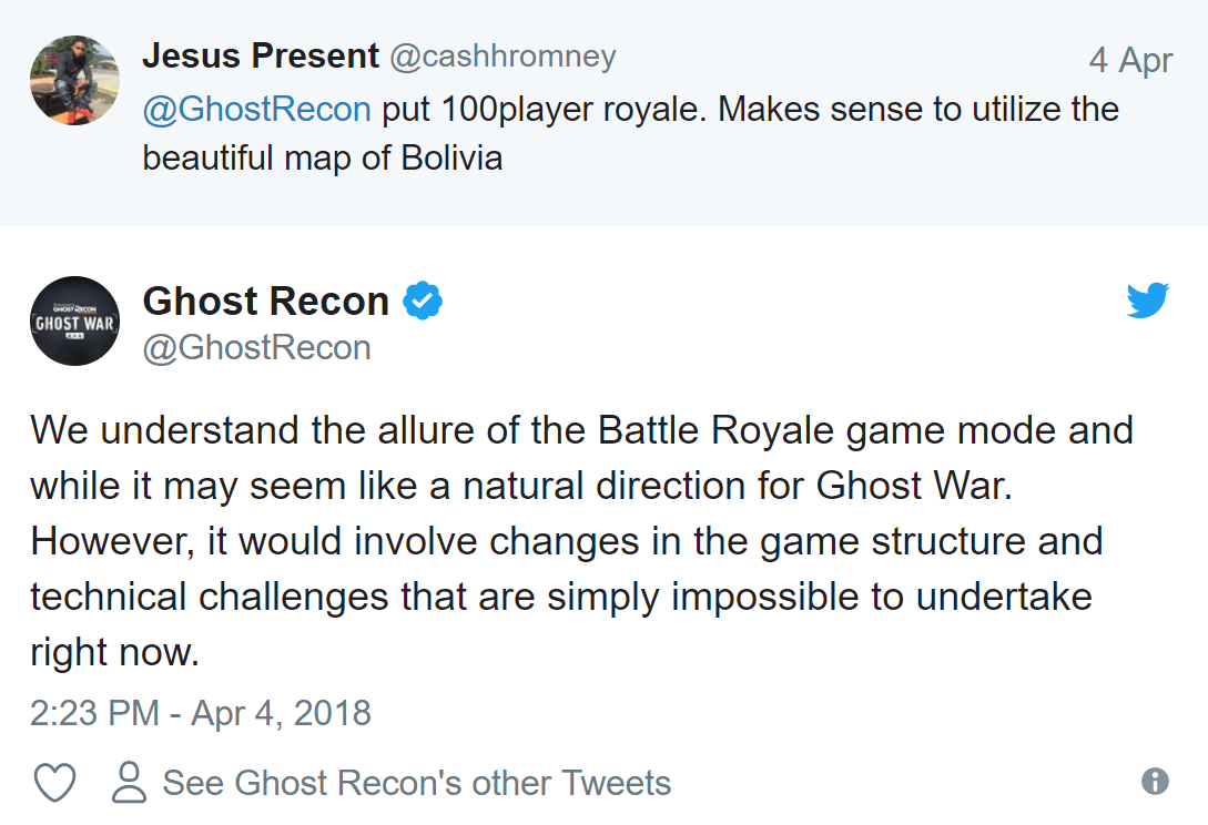 “Entendemos el encanto del modo de juego Battle Royale y bien puede parecer una dirección natural para Ghost War (Modo PvP de Wildlands). Sin embargo, implicaría cambios en la estructura del juego y desafíos técnicos que simplemente son imposibles de llevar a cabo en este momento,” dijo Ubisoft en el tweet.
